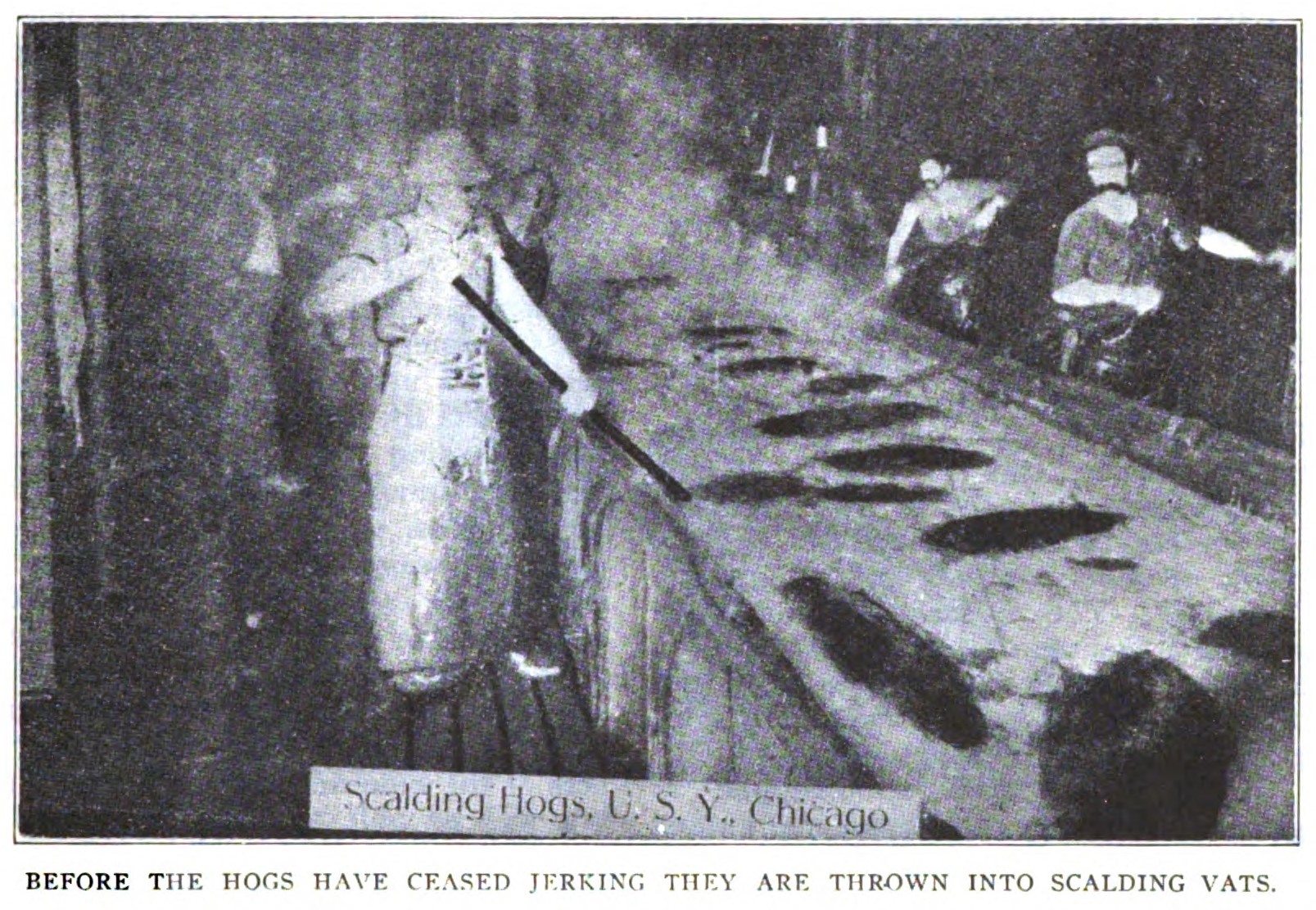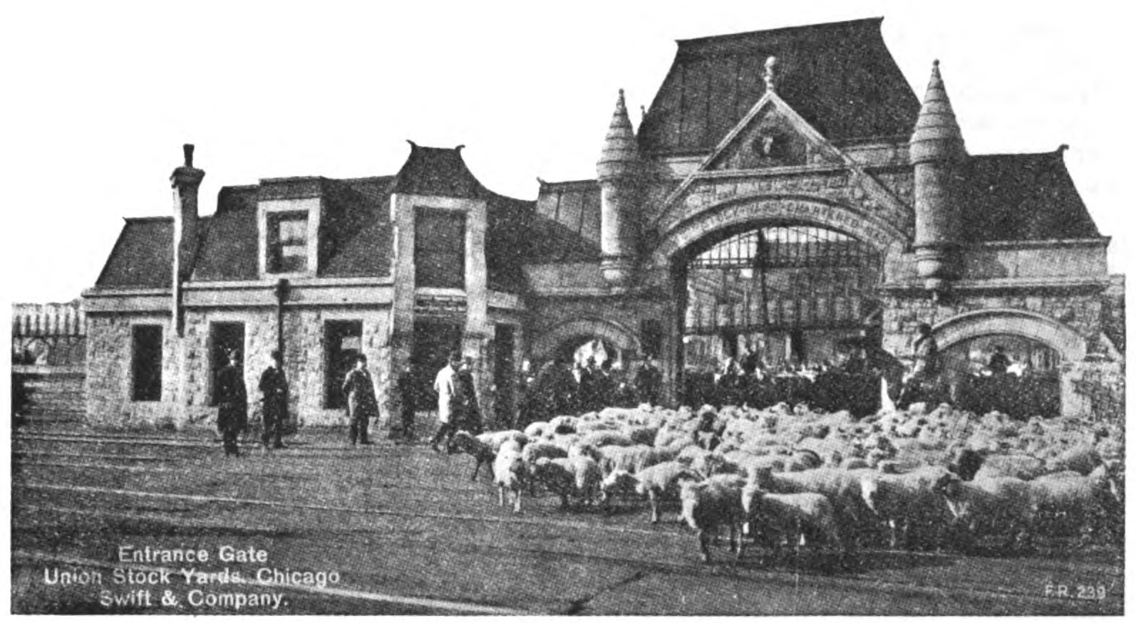 How the Beef Trust manufactures its own tin cans, builds its own: refrigerator cars, established its own printing plant and daily paper (The Drovers’ Journal), the story of its ice manufacturing plant, how the entire industry is a community in itself, containing more workers and their dependents than the state of Nevada possesses population, it would take a whole volume to tell. But in these days of scientific production everything is saved. Odds and ends are worked up into soap, glue, grease, fertilizer, collar buttons, combs and other useful commodities.