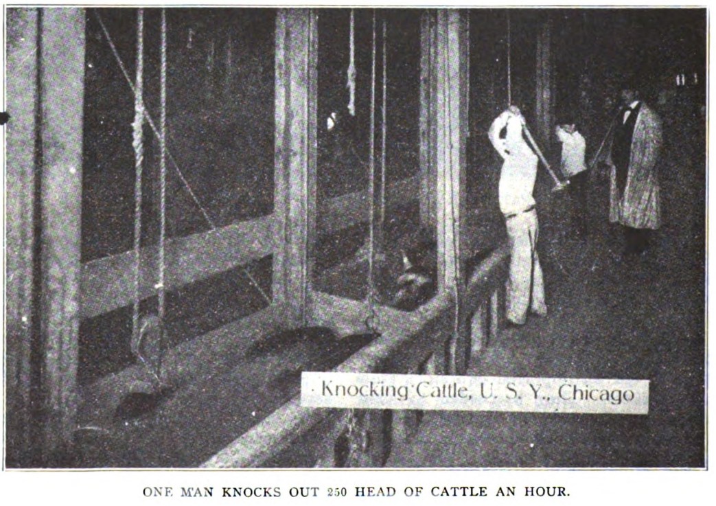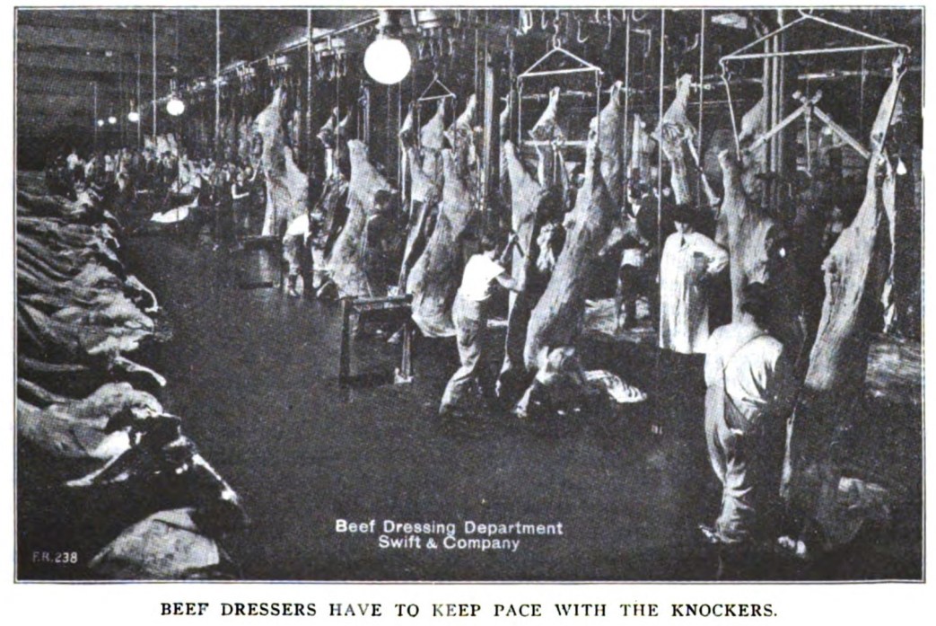 Forty-six operations, again subdivided into over 120 hand operations, are required, for example, in the beef-killing department. The man who stuns the cattle with the huge iron hammer is compelled to knock down 250 head in one hour, the men cutting the throats performing and the other operations are obliged to keep the pace set by the “knocker.”