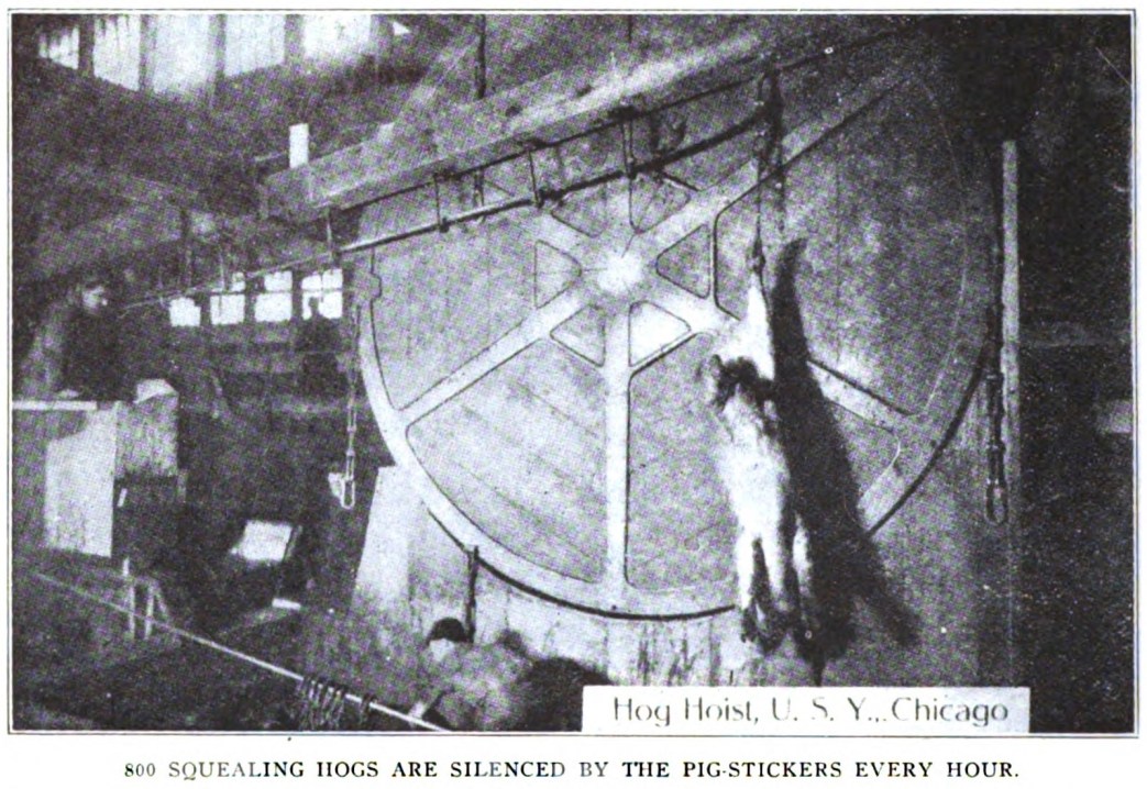 Squealing and kicking, a hog is jerked into mid-air by an automatic wheel bearing a chain attachment that hauls up the next porker. The pig-sticker is compelled to stop the screams of 800 hogs in one hour. With equal rapidity other functions are performed.