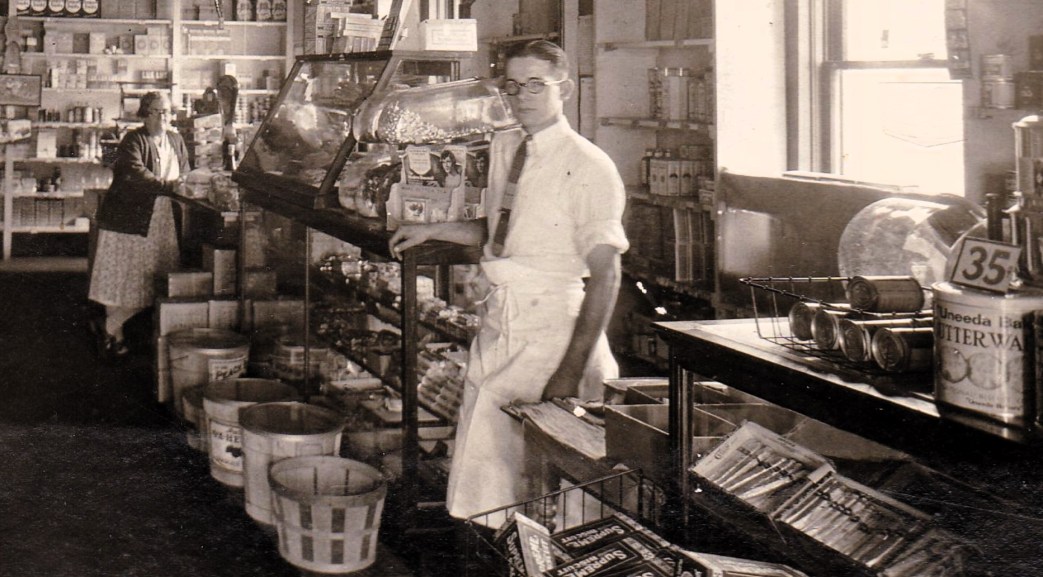 Low wages and long hours greet the aspirant as he takes off his coat, and puts on the soda-dispenser’s smock of the chain store flunky. He must cultivate an oily tone of voice, a sleek approach to customers, an accurate memory for locating ketchup and tuna fish, and oystershells; he must add rapidly, and when not putting these—talents to use, must apply himself at the handle end of a broom, and sweep the rotten lemons, squashed cantaloupes, mushy onions and crushed prunes, and papers that litter the floor at the end of a day’s work.
