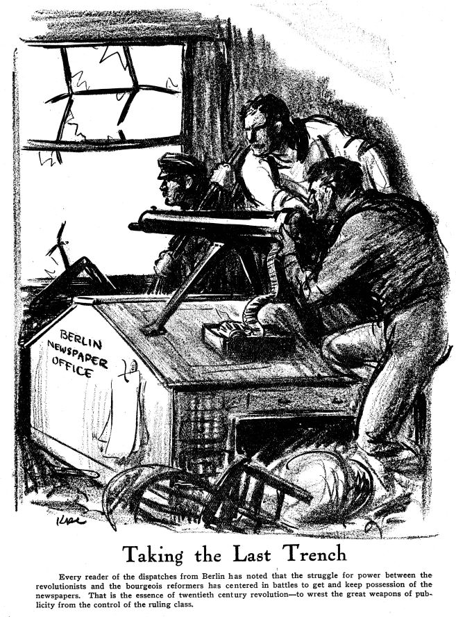 THE “Socialist government” had by this time largely succeeded in getting Berlin garrisoned by reactionary troops, with a heavy proportion of officers in enlisted men’s uniforms. The original conscript army of the Kaiser, the kind of an army that is dangerous, spent the time of the crisis in faltering, trying unsuccessfully to make up its mind. The Volksmarine Division couldn’t make up its mind. At the moment when the weight of one thousand well equipped troops would have turned the balance, captured Berlin and perhaps all Germany for the Revolution–the soldiers, the private soldiers, the soldiers that wanted a revolution, moped in the barracks, unable to decide what to do. The officers knew what they wanted, and acted quickly. I saw many a “private” doing sentry duty those days whose face had a singularly aristocratic appearance.