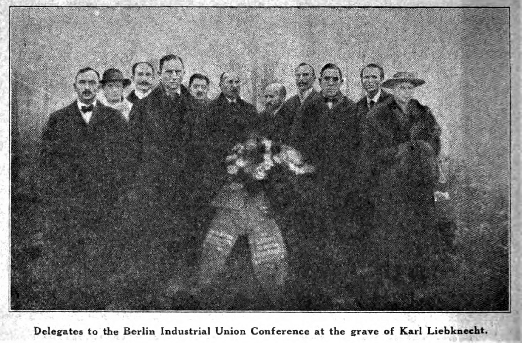 This little group of men, assembled around Karl Liebknecht’s grave, represented the class-conscious workers of many lands. Their presence on the consecrated ground where lay buried one of the most valiant fighters for the liberation of the working class, whose life was like a blazing star lighting up the path of progress, symbolized the historic mission of the workers of the world—the abolition of wage slavery, exploitation, and the private ownership of the means of life, and the establishment of Labor’s Commonwealth.