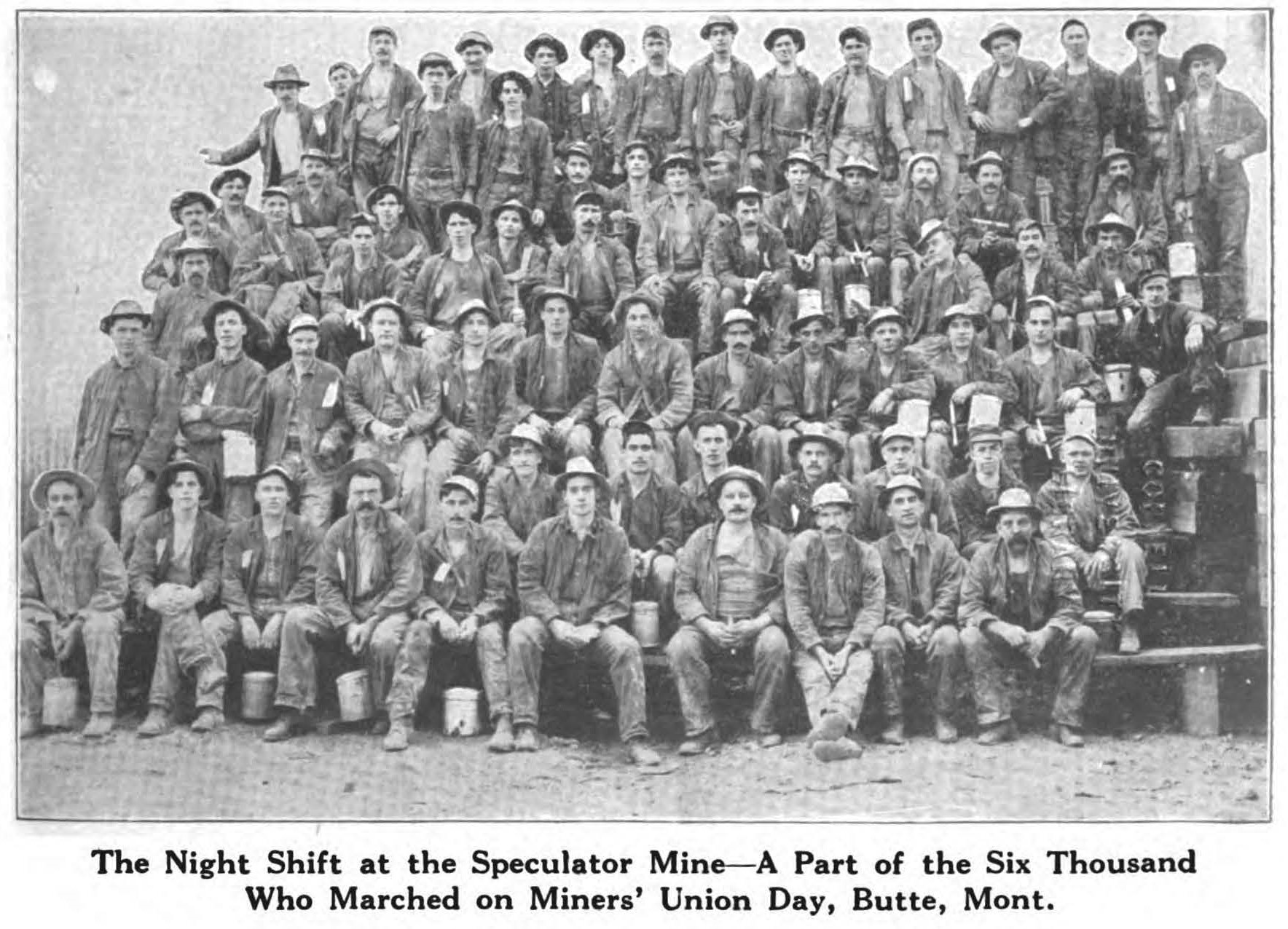 Two tally-hos carried a score or more of Butte’s oldest miners. These grizzled veterans of the war of industry have for more than a quarter of a century contributed largely to the fortunes of so-called “copper kings,” many of whom have never seen the mines of Butte. These disabled and aged workers would have been deprived of the privilege of participating in their union’s demonstration had not the union itself provided means for their conveyance.