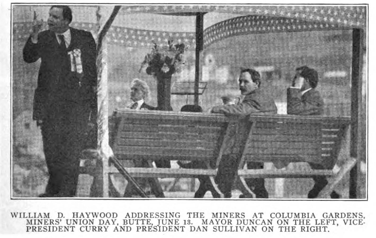 Haywood and Mayor Duncan were the speakers at the gardens. The Socialist mayor was entirely at home before a working class audience, as he has been fighting the battles of the workers more or less successfully for many years in Butte.