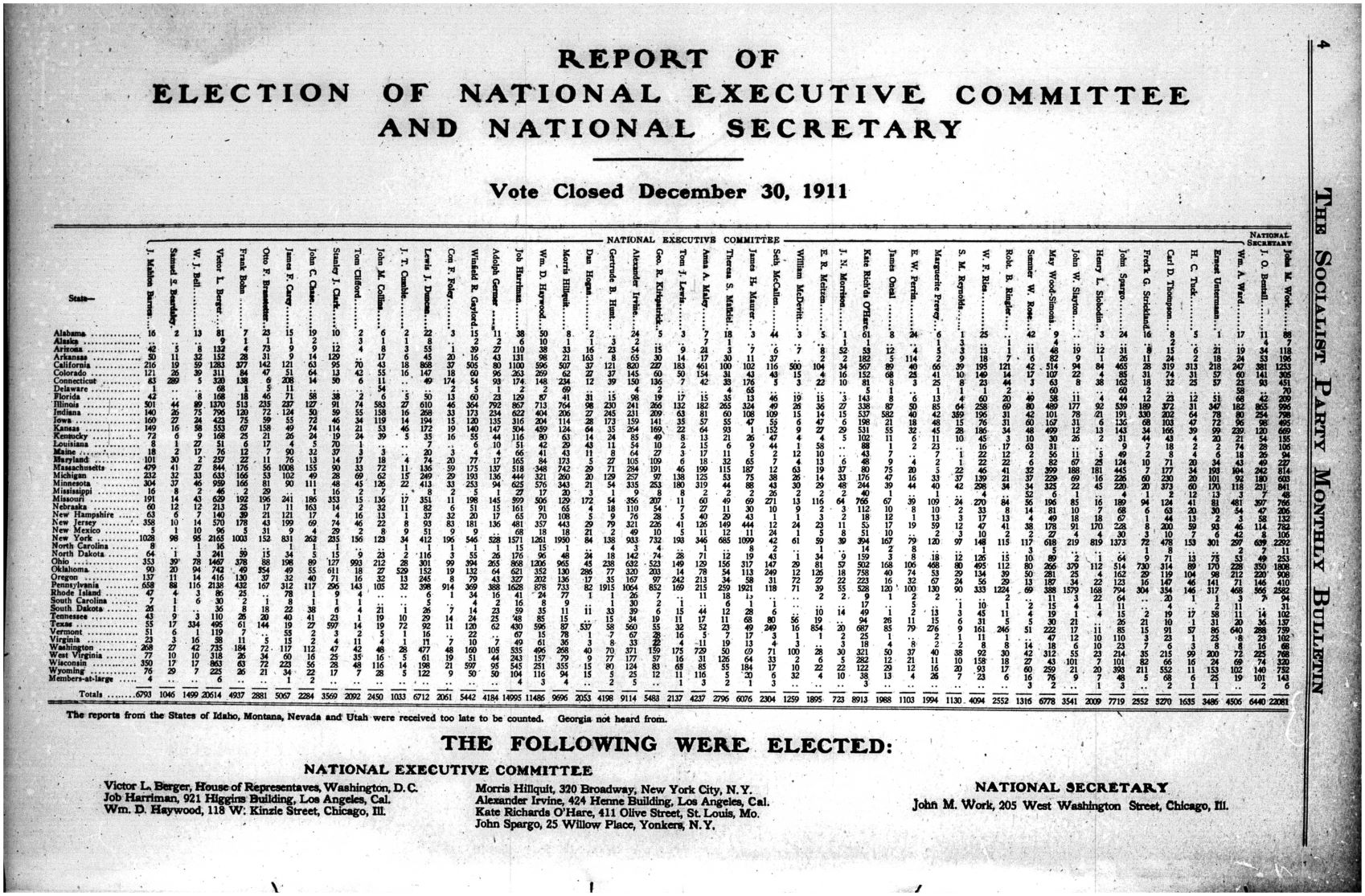 William D. Haywood and Frank Bohn ran for the Socialist Party’s leading National Executive in December, 1911 as part of an organized left-wing campaign. Haywood was elected with 11,486 voted while Bohn received 4937. Other leftists candidates also ran, but none came near Haywood’s numbers, which were below grandees Berger, Harriman, and Work, but well above his chief antagonists Hillquit and Spargo. Below are Bohn and Haywood’s statements to the membership on their candidacies.