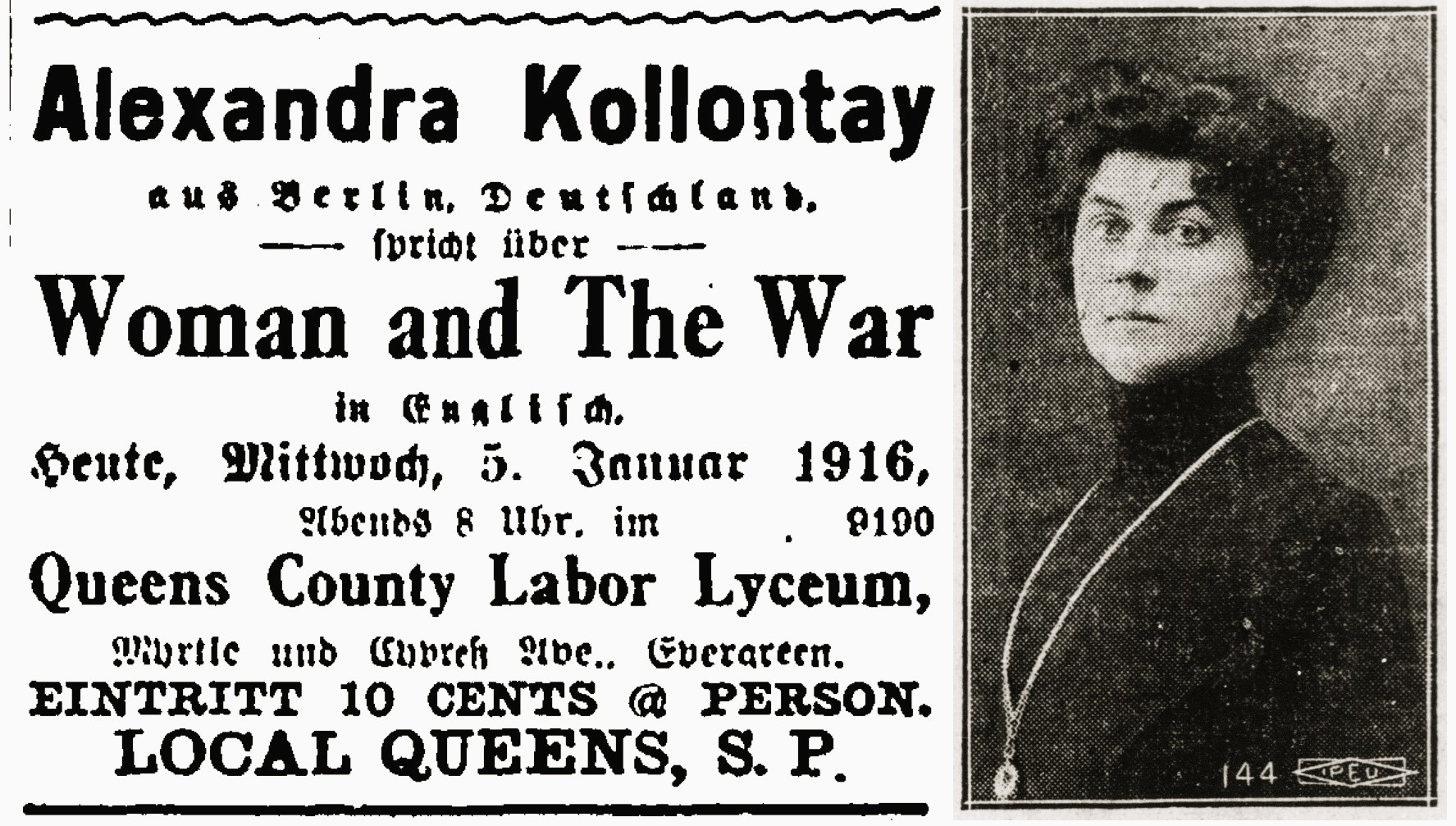 Alexandra Kollontay, who will speak in Freie Gemeinde hall Sunday afternoon and night, is described as a remarkable linguist and international revolutionist in an interview by William M. Feigenbaum in The New York Call.
