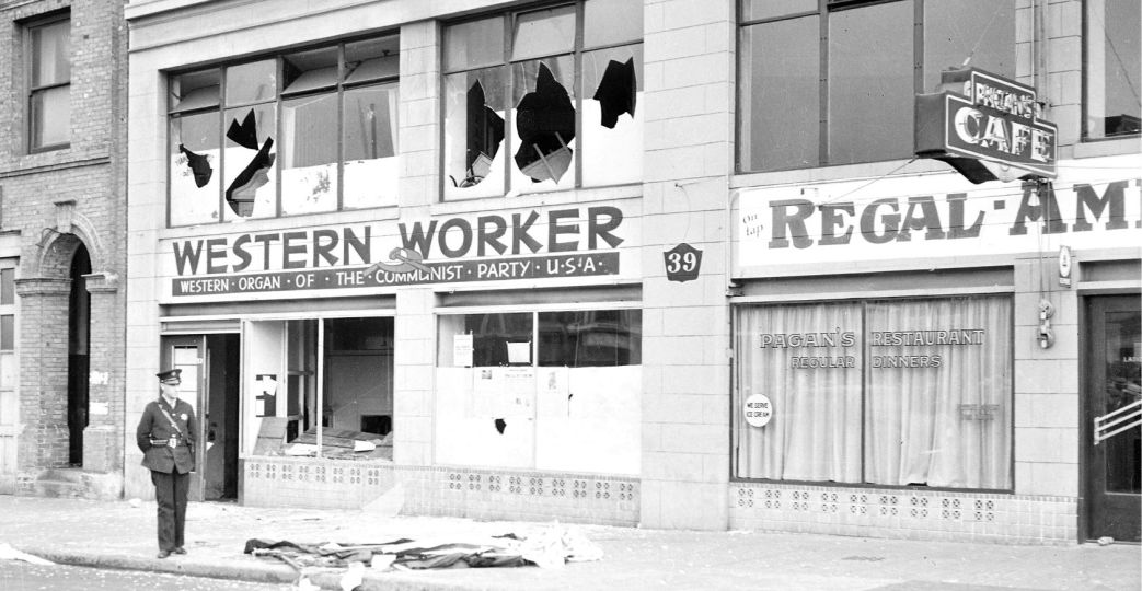 As a matter of fact, the “reds” controlled nothing–with the exception of the communist Marine Workers Industrial Union, one of the nine maritime unions in the original waterfront strike. It claims a membership of about 500–mostly seamen. It was the only authentic communist organization in the whole strike. There were, to be sure, some communists of varying tendencies among the 3000 members of the San Francisco Longshoremen’s Union. The Union itself was militant but certainly not “communist controlled.” The Teamster’s Union, which went out in sympathy before the general strike was declared, is anything but communistic. (Some of its members later participated in the wrecking of radical headquarters; there are plenty of Legionnaires in the San Francisco trade union movement.)