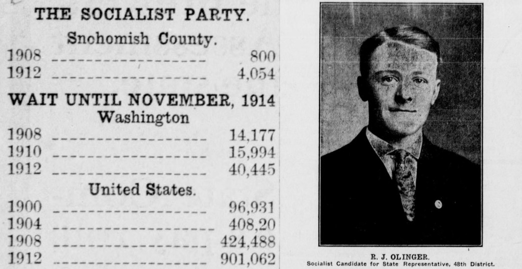 R.J. Olinger, one of the Socialist Party candidates for State Representative in the 1st district is by occupation an electrician, he has been an active member of the Socialist Party for a number of years and has been called upon by his comrades to become a candidate of the Socialist Party a number of times to represent the working-class. Before joining the Socialist Party, he was an active worker in the Trades Union movement in Everett and has worked hard to make the Union movement in Everett a revolutionary one, the result being that the Electricians’ Union, of which he is a member, is a Socialist Red Card Union. Comrade Olinger was at one time president of the Trades Council in Everett, and an active worker in all movements for the emancipation of the working-class. He is reputed as being one of the highest priced wageslaves in Everett and also one of the most rebellious ones.