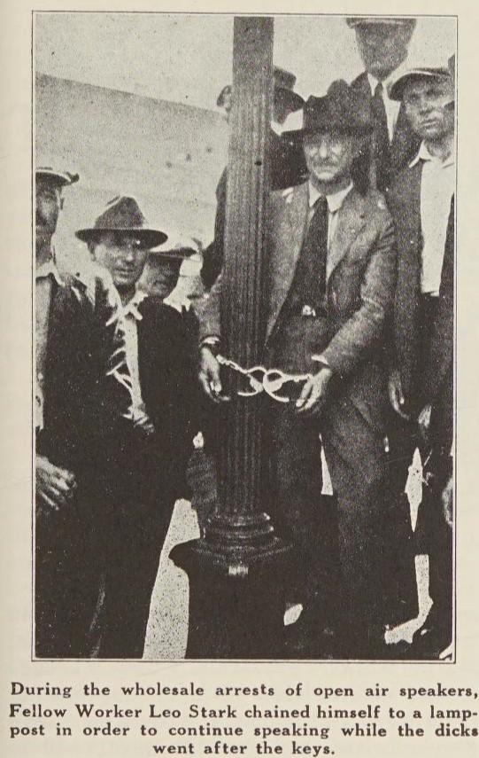 Somewhere in this magazine you will see a picture of Leo Stark handcuffed to a telegraph pole. It was his way of winning a free speech fight. He guaranteed that the police couldn’t drag him away till he had finished his organization talk. That was the night Captain Plummer’s brave “bulls” arrested thirty wobblies for exercising their constitutional rights of free speech, and it was before a woman loaned her lot on Liberty Hill to the strikers for their meetings. Well, Leo Stark isn’t exactly a youngster, though he’s only been in the radical labor movement for thirty or forty years in nearly as many continents as Gelpke. Stark is a speaker and newsboy. He sells five hundred copies of each issue of “The Industrial Pioneer,” “Industrial Solidarity” and “Industrial Worker,” and is said to be a wizard at disposing of wobbly song books, pamphlets, and so forth. Of course he’s out on bail as a criminal syndicalist and has a forty-day jail term awaiting him for a street speech charge, but that doesn’t bother him after the Wichita oil workers’ case, in which he invested four years.