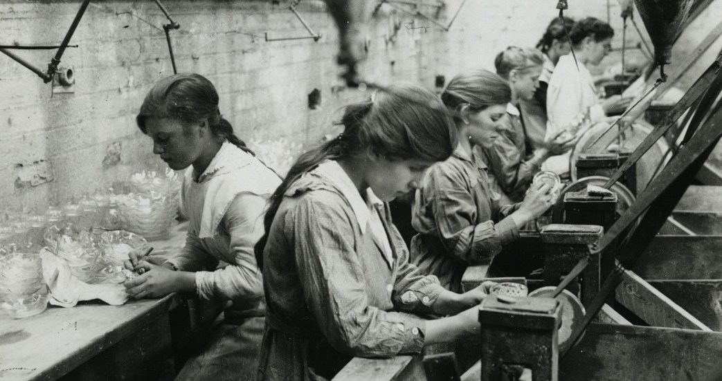 Not much capital is necessary to start a cutting shop, hence the great number of small one-, two- and three-men shops. Glass manufacturers frequently threaten to boycott these shops but for both economic and artistic reasons they have thus far largely supplied the cutting shops outside. There are probably five thousand cutters in this country. It is understood we are not including those who bevel plate glass and mirrors, or who trim stained mosaics. The cutters were once on the road to organization in the American Flint Glass Workers’ Union, attaining 2,000 members. This has dwindled to about half. War industries offering greater remuneration took many from the trade.