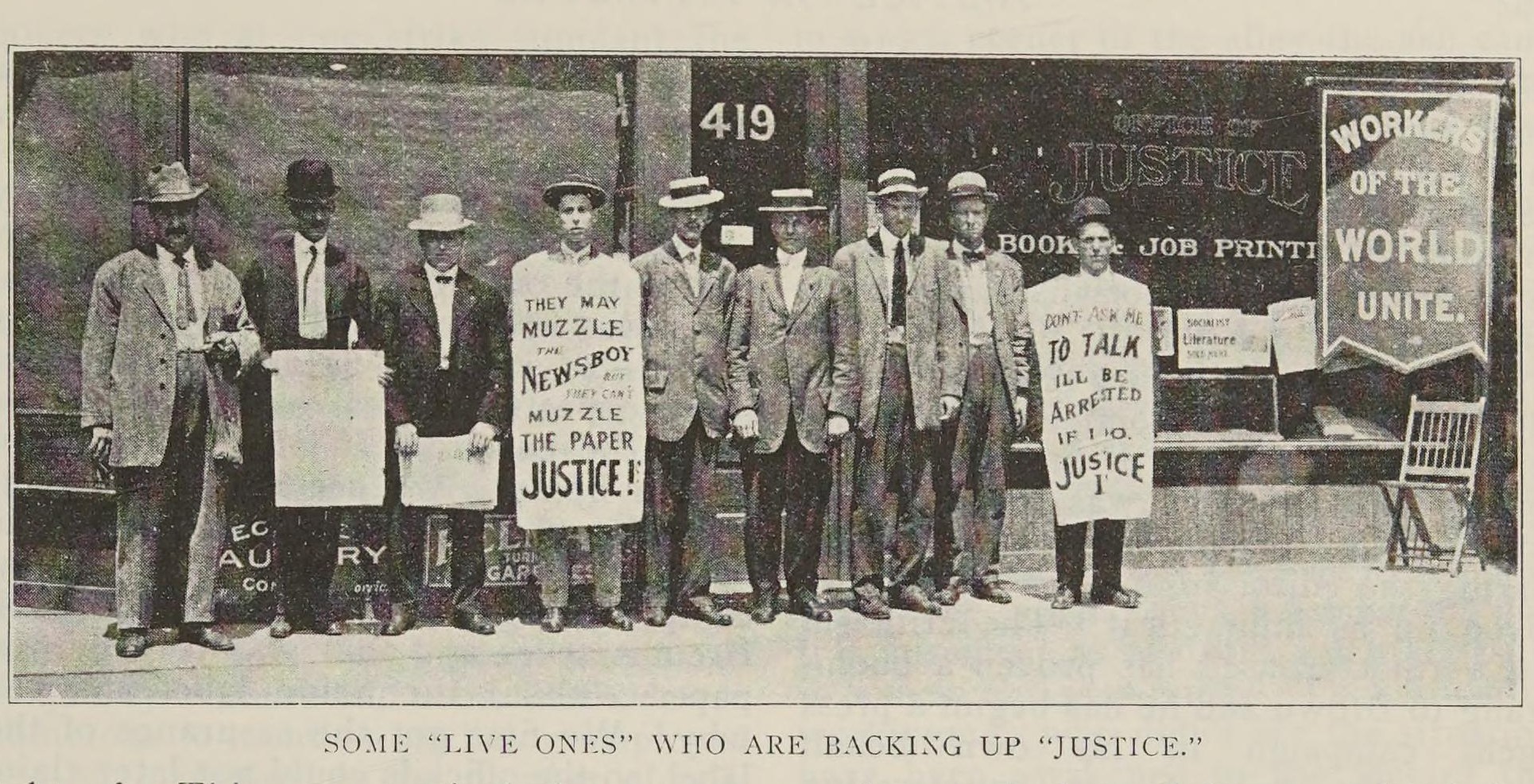 One of the first things decided upon was that “Justice” should advocate the principles of industrialism as strongly as we did political action. But following the rule of local news we deal with it only as current local events give rise for comment. As the local unions are extremely corrupt we felt that an explanation was due at the outset. The local typographical union had notoriously and repeatedly prostituted itself to union scabbing and if we expected to deal with this evil we would be cowardly to omit that organization because we needed their friendship to publish the paper. There was only one thing left for a militant and uncompromising sheet to do under such circumstances and that was to print the paper without the union label and tell why. We first got the assurance of the label, so the officials could not later claim we were disappointed soreheads, and then went after their treachery. The educational merit of a discussion on industrialism was greatly intensified by the omission of the label. Many good comrades who have for years been worshipping at the shrine of the label without investigating whether the label was a guarantee of its professions but who endorsed the principle of industrialism had their idol smashed much quicker because we did not carry the label. Of course there were politicians in the organization who said we were right, but that it would cost the party many votes by those who misunderstood and our reply was simply that we were out to educate first and get votes after the voters had become class-conscious, not before. JUSTICE was denounced as a union smasher, but has outlived the criticism in a remarkably short time. A sad commentary on craft unionism here is that the only protest received from those outside the party was one anonymous letter.