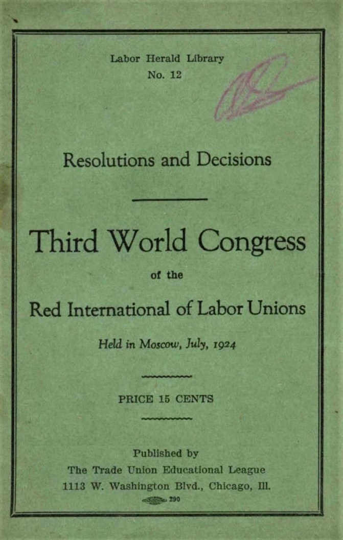 Resolutions and Decisions of the Third World Congress of the Red International of Labor Unions Held in Moscow July, 1924. Labor Herald Library No. 12. Published by the Trade Union Educational League, Chicago. 1924.