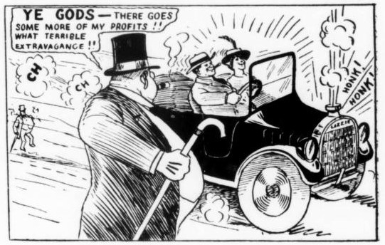 When an employer of labor, for example, sees a workingman who has slaved away in some machine shop or mill or factory for twenty years, riding around in a Ford automobile of his own, he just naturally foams at the mouth and shrieks that the only way to save society from utter barbarism is to lower wages right away.