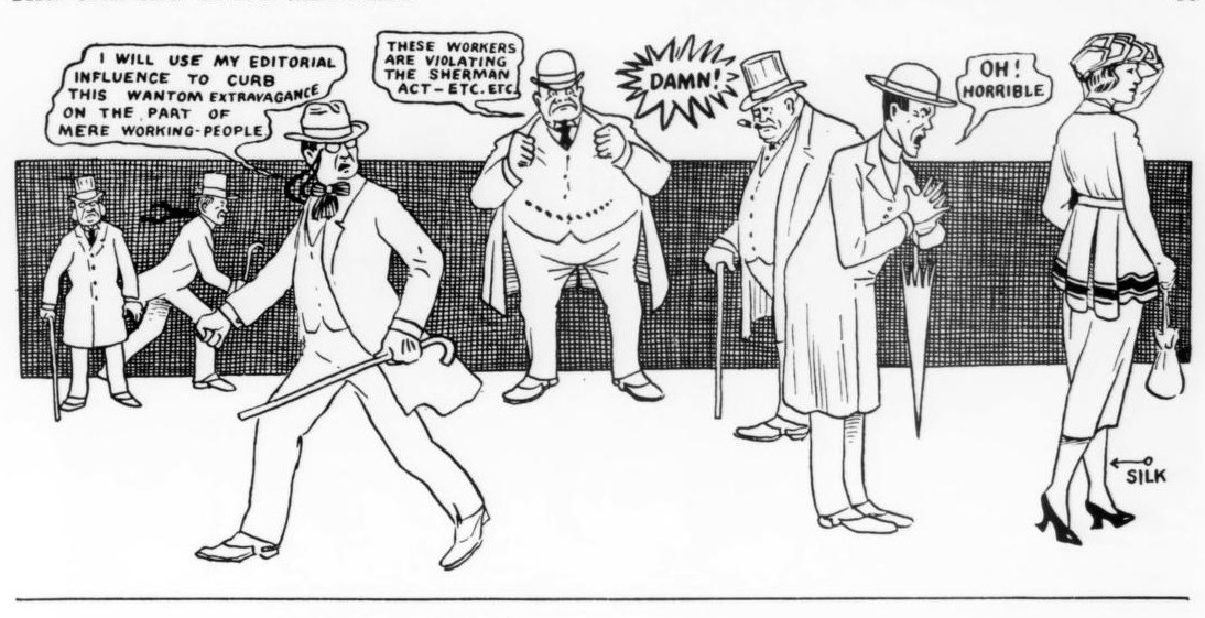 A silk shirt on a workingman unites the entire capitalist and parasitical classes against the productive workers in society as nothing else on earth can. It draws attention so patently to the difference between the new and the old conditions, and it strikes the fear of the giant home into the hearts of those who prey upon society.