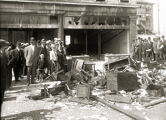 On July 18, 1913, the day following several disruptive soldiers being disciplined by participants of a women’s suffrage street speaking event, and incited by the press, soldiers and sailors rioted during a Seattle city festival, trashing the halls of the I.W.W. and Socialist Party, and wrecking Socialist newsstands.