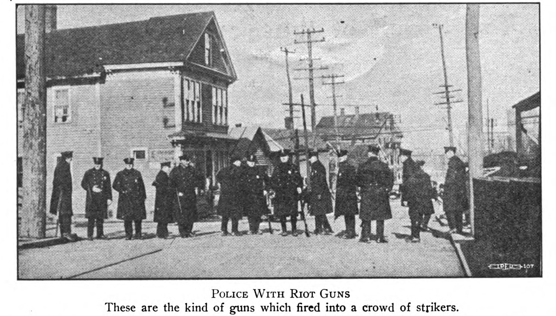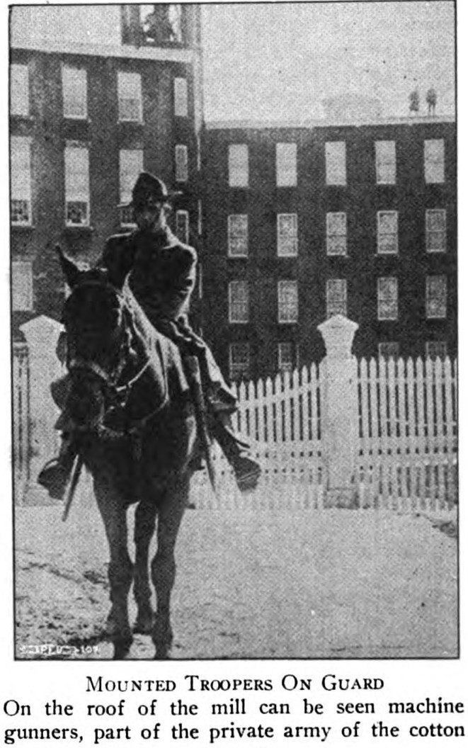 The mill-owners, swollen with their fat war-profits, and filled with rage at the rebellion of their hitherto so meek employees, fought the strike with great bitterness. With their enormous wealth they control the State institutions, and quickly the militia was thrown into the strike areas with instructions to shoot to kill. Private armies were also recruited, and the mills became small fortresses, with machine guns on roofs, and thugs and gunmen at every turn. Police were armed with shotguns. All this array of millions and of guns was pitted against the soup-kitchens and solidarity of the striking cotton workers. The guns killed several of the strikers, but solidarity kept the mills closed.