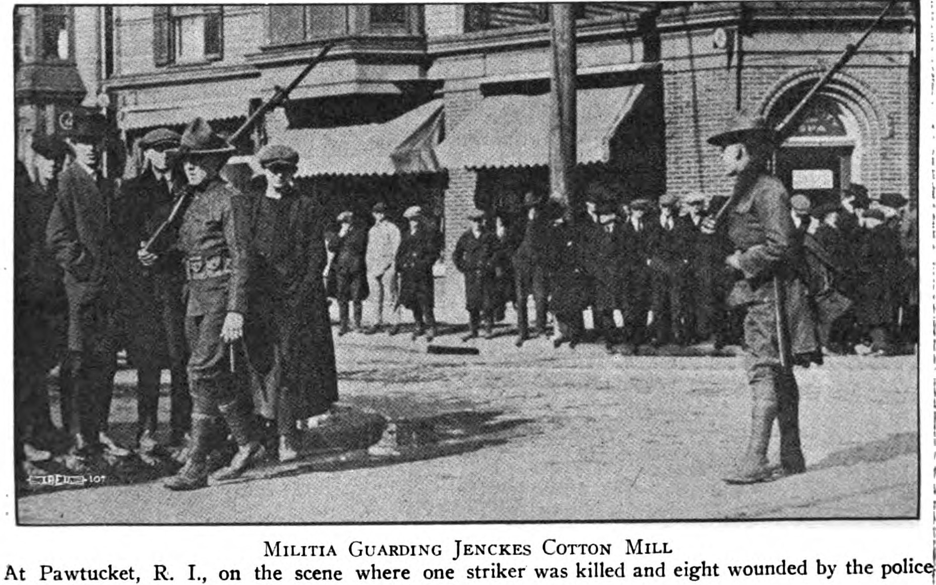 In the adjoining Blackstone Valley things went slower–not that the rank and file of the workers willed it so, but the red tape of officialdom held them in check. In that valley the United Textile Workers of America. had a few locals of different crafts or departments. These naturally wanted their national officers to take the helm. But the International President was taken sick, and other “important” incidents happened to hinder action, so that nearly two weeks went by before the mills in the Blackstone Valley started to come out Their strike was not so prompt and clear cut as in the Pawtuxet Valley, but eventually they tied up all the mills and established a solid front.