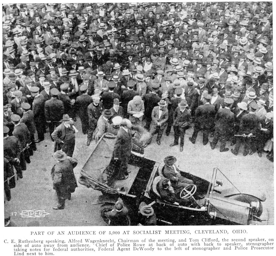 Altho the police are always in evidence at the meetings, as shown by the accompanying picture, and a court stenographer takes down the speeches for the federal authorities, the only trouble thus far has been the arrest of Alfred Wagenknecht, state secretary of the party, at a meeting held May 27th, and of Charles Baker, state organizer of Ohio, at one of the street meetings. Both comrades are charged with disorderly conduct. Comrade Wagenknecht was in the midst of an anti-conscription argument when stopped and Comrade Baker was arrested on the trumped up charge of a war patriot who tried to break up his meeting, that he had made disrespectful remarks about the flag. The “Socialist News” local weekly of the party, has been withheld from the mails for two weeks, but hundreds of Reviews have been sold.