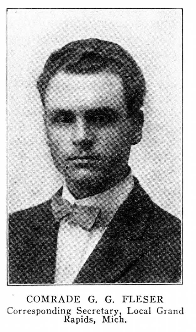 Among the indicted comrades are Ben A. Falkner, financial secretary of the Local. For years he has been employed in the city water works department. He has been fired and blacklisted by the political patriots. Comrade G.G. Fleser, corresponding secretary of the Local, who had worked eight years for the Grand Rapids and Indiana Railroad as a stenographer, was discharged by the patriotic rail-plutes. Viva L. Flaherty, social worker and writer; Charles G. Taylor, member of Board of Education; James W. Clement, manufacturer; Charles J. Callaghan, postal clerk (discharged); Dr. Martin E. Elzinga; G.H. Pangborn; Vernon Kilpatrick; Rev. Klaas Osterhuis, and our well-known, active old-time Comrade, Ben Blumenberg.