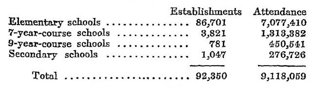 In addition there were 3,338 kindergartens with 257,715 pupils, 1,164 combined kindergartens and creches with 61,450 children, 264 settlements for normal children with 46,735 children, and 540 settlements and institutions for defectives with 33,826 children.