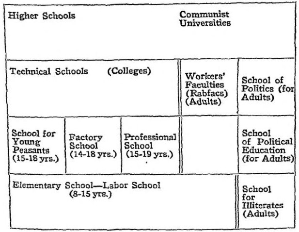 Education of the adult population, whether in forms of political education or in the rabfacs, is regarded as of only temporary importance. With the coming of a generation of educated children the regular educational system as outlined above will do this work.