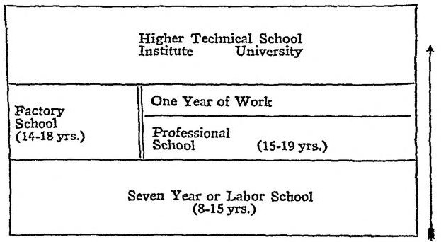 Ukrainian educational authorities modify this scheme in two important ways: First, they make a break of one working year between the professional and the technical schools. Second, they concentrate all of their attention on technical work and higher scientific work, thus practically eliminating the university. Their scheme for child education, as outlined to me by two of the leading men in their school system, is as follows: