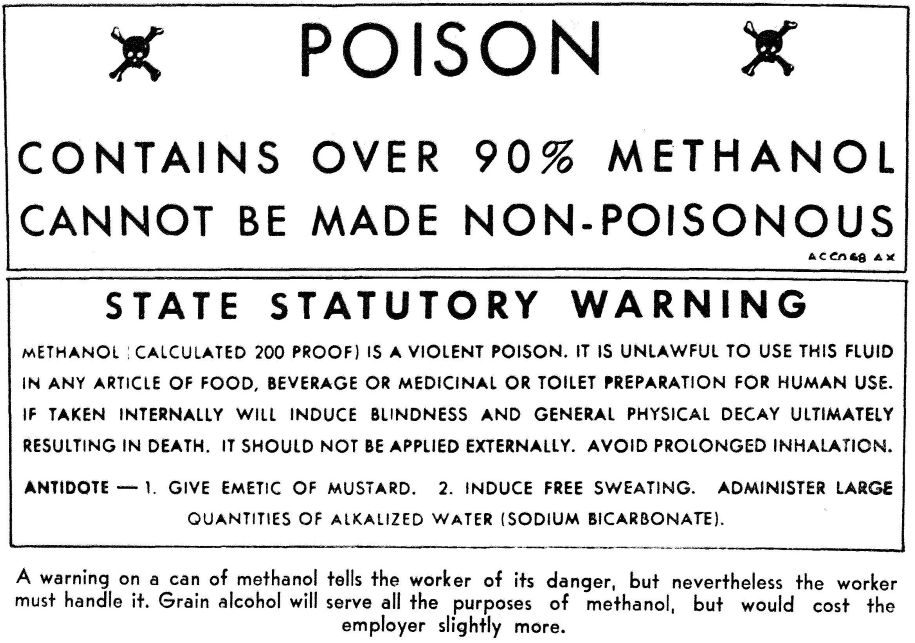 “Wood alcohol can be absorbed through the skin or through the lungs, and gain entrance into the blood stream and cause the same train of symptoms as is caused by taking the alcohol internally as a beverage…With the one exception of carbon monoxide, wood alcohol is the most deadly poison used in our daily work.”