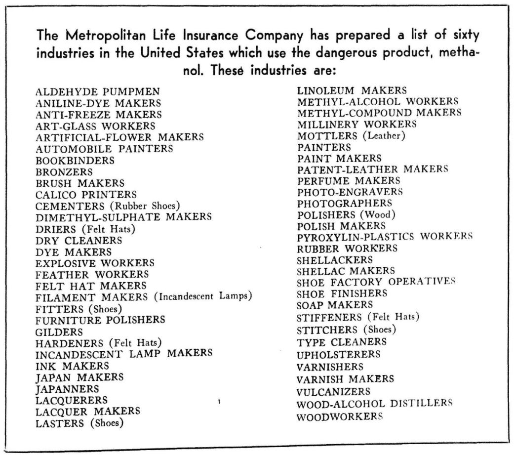 Cases of workers who went blind or died as a result of using wood alcohol (methanol) in their daily work have been collected by Professor William D. MacNally, of the Department of Medicine of Rush Medical College in Chicago. Professor McNally, considered by scientists one of the country’s leading authorities on industrial hygiene, stated at the conclusion of his investigation: