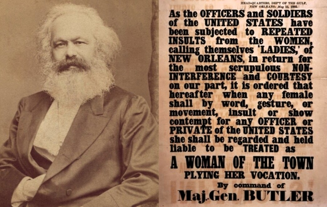 Karl Marx despised bourgeois hypocrisy. After Union armies liberated New Orleans in May, 1862 commanding General Benjamin “The Beast” Butler (one of the more interesting political figures of the late 19th century) issued General Order No. 28 against the propertied women of New Orleans for interfering with Northern troops. The British ruling class and its press were outraged at this violation of Southern womanhood, to which Marx replied with this blistering article for Die Presse on June 20, 1862.