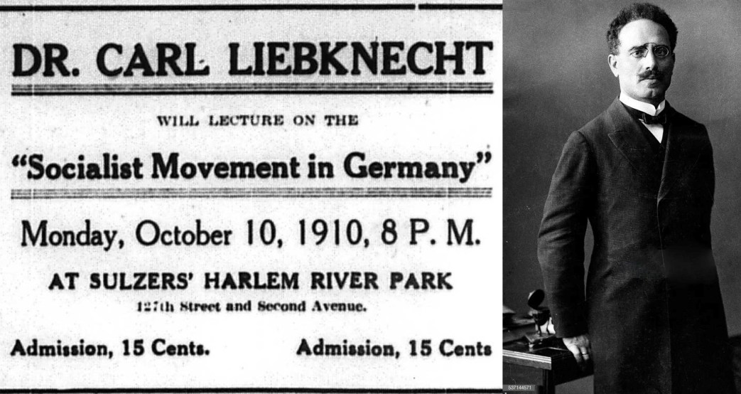 “Enter upon this struggle for International Socialism with all the faith and zeal in the world, for you are not fighting for a vision, for a dream, but for a natural law. For Socialism must follow upon capitalism, as surely and as inevitably as day will follow this night.” The chairman of the evening, Lore, at the conclusion of Liebknecht’s speech warned the audience that on November 6 is election day when they will have the opportunity to put the advice of Liebknecht into practice by depositing their ballot for the candidates of the Socialist party and seeing that their neighbors do the same. The United Singing Societies gave several selections.