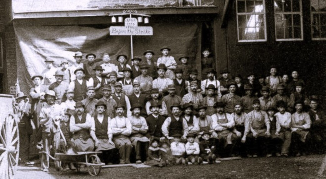 On the morning of Sunday, July 26, the sun rose bright upon a cloudless sky. The weather was auspicious and by 9:30 strains of music were heard upon the air and the various organizations began to assemble at the place of rendezvous on Clinton and Lake streets. By 10:30 the procession had formed on Market street between Randolph and Madison, and the line of march taken up. The procession was composed of seventeen groups of the International, in addition to the following trades unions: Progressive Cigarmakers’ Union Furniture Workers’ Union, International Carpenter’s and Joiners’ Union, Central Labor Union, Trimmers and Tassel Makers’ Union, Metal Workers’ Union, German Carpenters Union, Frescoe Painters’ Union and Butcher’s Union. The Lehr and Wehr Verein, the workingmen’s military organization, presented a soldierly appearance in their blue blouse and black pants, and were armed with Colt’s navy revolvers (it being unlawful for workingmen in Illinois to parade with rifles.) Thousands of spectators lined the sidewalks to witness the formation of the procession which began to move off to the martial strains of four brass bands. Comrades Samuel Fielden, August Spies and Oscar Neebe were mounted on horses and acted as marshals. Several thousand men took their places in the line of mar bearing aloft the following inscriptions, painted in white letters upon red banners: