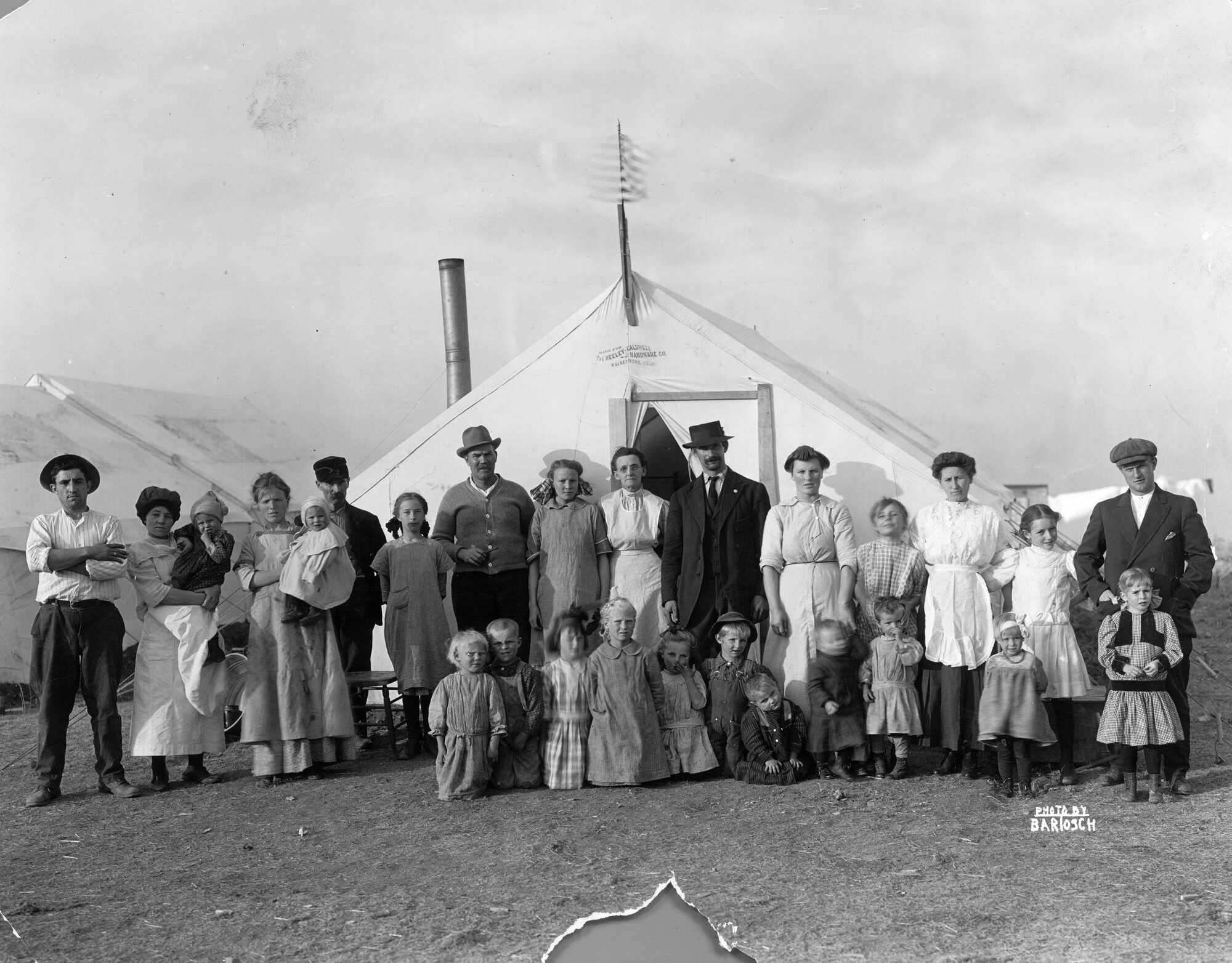 Trinidad, Colo. Lieutenant Linderfelt began arranging his men for attack upon the unprotected city. The militia started their work afternoon when they began insulting women and children and tried to break up the ball game between Ludlow and Segundo. They taunted the strikers throughout the afternoon and did everything in their power to bring about a fight. The gunmen were accompanied by women of the underworld, who likewise applied taunts to the good people around them. Then, just as dark was about to surround the tented village, the gunmen began to fire upon the harmless people. All the lights had to be extinguished early, for the protection of those inside. The attack was entirely unexpected, although it was predicted that the gunmen would start something during the day.) But just before daybreak, before most of the strikers had left their beds, a fusillade of shots greeted them. They all came from the hills and riddled several of the tents. Men, women and children, many of them undressed, rushed out and were greeted with another round of shots from the killers in the hills.