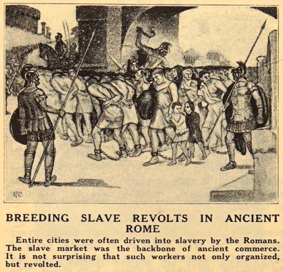 The “jus coeundi,” or law permitting free organization, had been a thorn in the side of Roman exploiters for centuries. Under its provisions labor unions were recognized by law. The slaves had, years before, taken advantage of this opportunity to organize. Throughout the centuries they had retained their organizations in the face of fiercest opposition. The patricians had succeeded in retaining their grasp upon the public or communal lands, which were stolen from the people and held in defiance of the law. Also they had supplanted free labor with slave labor on their vast estates throughout the world. Like the lumber barons of today, the Roman patricians did not intend to permit their human beasts of burden to organize and put a stop to the process of exploitation. The law permitting slaves to organize was being fought with extreme ferocity by the land owners and their tools in the prostituted Roman Senate. Then came the gladiator, Spartacus, and the rebellion that bears his name. Capitalist historians have tried to suppress the facts about this monumental revolt but it stands as one of the greatest labor struggles of history.