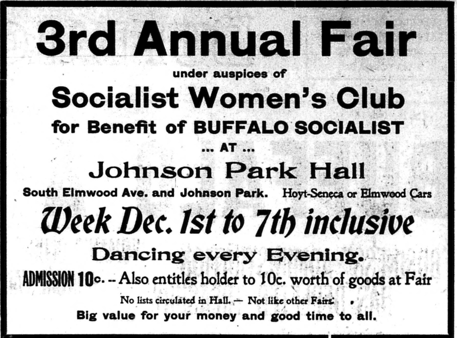 WOMAN’S CLUB OF BRANCH TWO. The Woman’s Club of Branch Two will meet at the home of Comrade Keddy, 191 Riverside Avenue on Friday, November 21, at 1:30 o’clock. The object of this meeting is not only to promote sociability among the women comrades of that locality but at the same time serves the purpose of preparing articles for the coming fair, the proceeds of which will be for the benefit of the Buffalo Socialist, Comrades are asked to bring their thimbles and scissors.