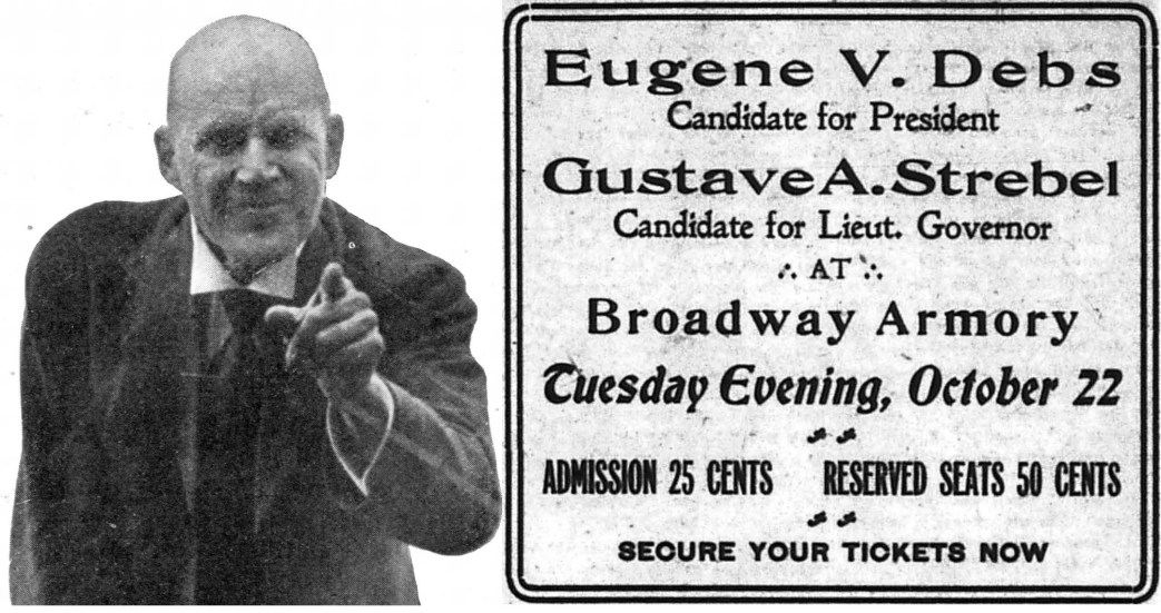 The Arsenal was none too big for the thousands who jammed Broadway Tuesday night, and every available inch of room was occupied by enthusiastic humanity. The building shook with the thunderous applause of the multitude, when Debs reached the dramatic climaxes of his magnificent eloquence; while in the periods where he sought to appeal to the tenderer emotions and sympathies of the great throng, hundreds were in tears and not a few sobbed aloud.