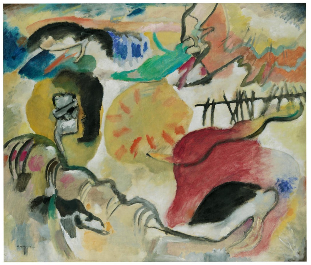 There was at the exhibition of the Independents a canvass signed Wassily Kandinsky, which more than any Cubist or Futurist work distressed the visitor. It represents nothing in particular. Daubs of color, green, grey, pink. Something in the center of the painting had a remote likeness to either an umbrella’s frame or a watermelon. And it was entitled “Improvisation.” Fortunately Kandinsky is not only a painter but a forceful, lucid writer, and his book, “Das Geistige in der Kunst,” gives us a key to the recondite meaning of his pictorial work.