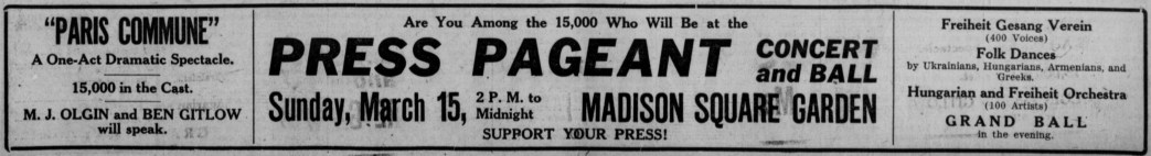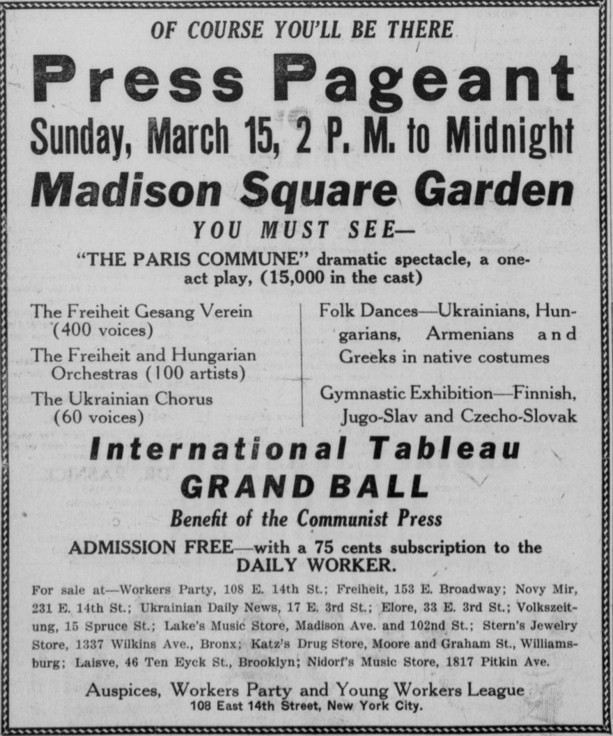 The workers of New York experienced a wonderful spectacle on Feb. 1, when 15,000 Communists and Communist sympathizers crowded Madison Square Garden in the name of Leninism. On March 15, the Garden will again be filled with Communists and their followers. The Communist press has arranged a pageant, ball and concert. March 15 is the date the Paris Commune and the lessons of that historical event are to be drawn once more—the lessons of the defeat of the workers of Paris— and the lessons that the Russian revolution has taught the workers—the lessons of victory. In order better to portray the action of the workers of Paris against the bourgeoisie whose assembly was gathered at Versailles, the committee in charge has arranged a pageant, that will excel for its magnitude. Hundreds of comrades and sympathizers, if not thousands, will participate in this grandiose pageant, which will be the biggest thing that the Communists of New York have ever undertaken. The pageant will be directed by Dr. Alexander Arkatov, who conducted the magnificent production of “The Dawn” in Moscow. The pageant will require a goodsized band—and above all a large number of comrades to act in the mass scenes. All comrades of the Workers Party, Y.W.L. and Junior groups who are willing to devote themselves to the pageant and to participate in it, should report at once to Comrade Fralkin, at the district office. Little time can be lost, as there are only three weeks left.