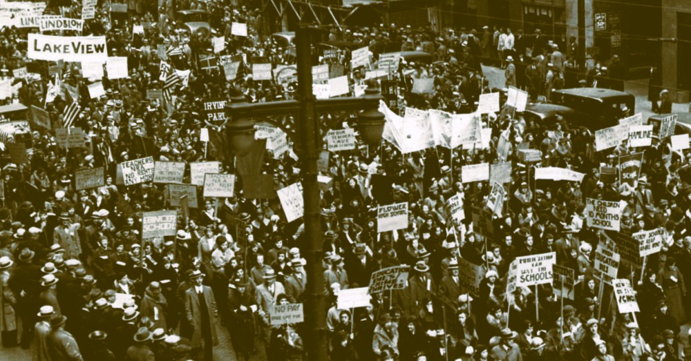 Chicago, site of some of the earliest teachers’ organization, the Chicago Teachers Federation was founded in 1897, saw 14,000 teachers go years with virtually no pay–and no fight back–during the early Great Depression. Vera Stone urges teachers, many products of parochial schools, to drop their passivity, ‘professional’ and ‘patriotic’ pretenses, organize, and push back. They would. In the months following this articles mass protests, new unions, parent organizations, and militant oppositions all appeared in the district in sustained campaigns. It would take until 1934, and federal funding, for the teachers to get paid.