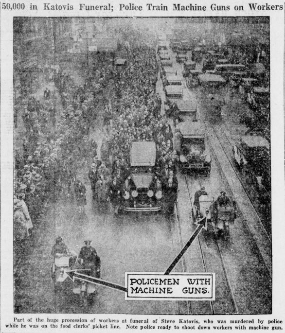 The huge machines of the press were rotating furiously. Millions of copies were being piled into bundles. Steve Katovis, 39, a worker, was being buried. He had been shot in the back by Patrolman Kiritz. The cop had pressed a pistol against the spine of unarmed Steve Katovis who had refused to give way on the picket line.