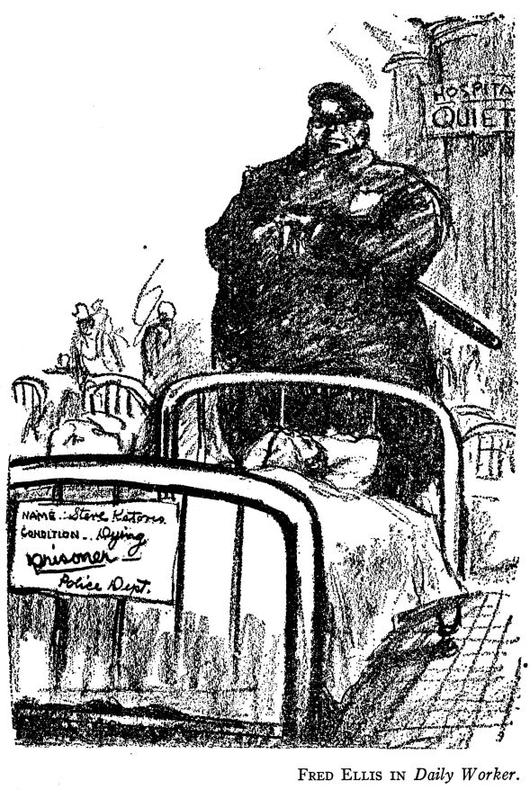The huge machines of the press were rotating furiously. Millions of copies were being piled into bundles. Steve Katovis, 39, a worker, was being buried. He had been shot in the back by Patrolman Kiritz. The cop had pressed a pistol against the spine of unarmed Steve Katovis who had refused to give way on the picket line.