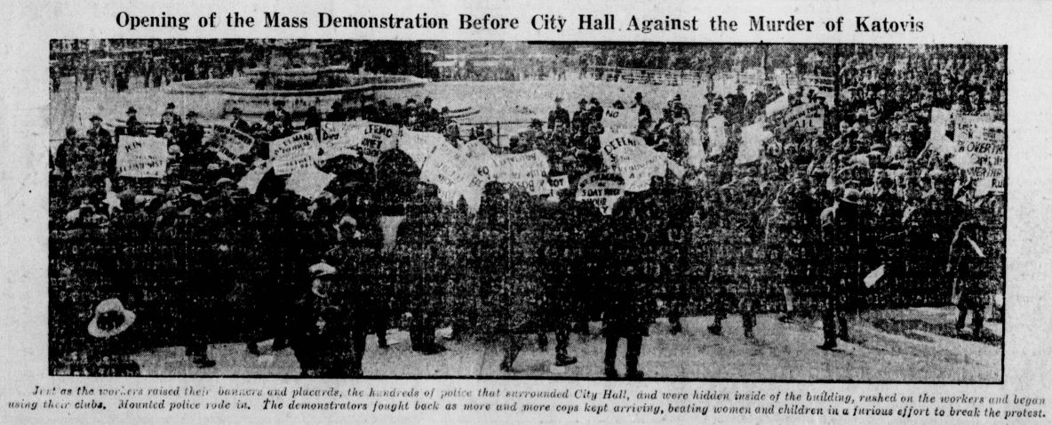 But there was a black banner across the front of the Workers’ Center and the workers knew of it. They had come by subway, by from the peace of their homes—from the Bronx, from Union Square, from Brooklyn, and had walked into the fury and storm of blackjacks, of cavalry charges, into the frenzy of Tammany thugs who had been given orders to “mop up” the crowd. The same spirit that had sent Steve Katovis to the picket line where he met his death had impelled the hundreds of New York workers to the City Hall to demonstrate against his murder.