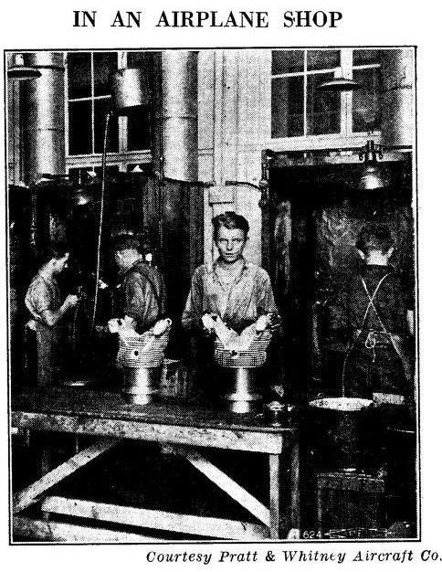 Although this newest of the industries is raining profits from the air on its manufacturers and financiers, its workers fare little better than those in other transport lines. A skilled tool and die maker, bringing into the airplane shop 10 to 30 years of all around machine shop practice, works for 85 cents an hour. Semi-skilled mechanics make 50 to 85 cents. Women working on the fabric coverings of wings get as little as 35 cents.