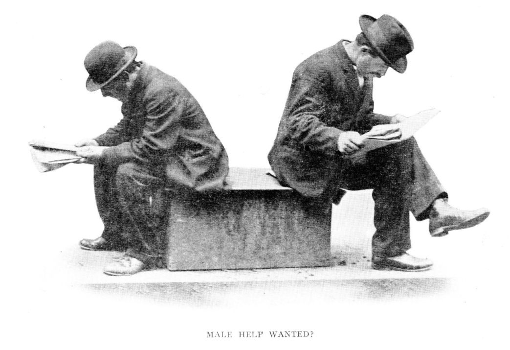 Besides the permanent industrial population of Chicago, casual workers are pouring daily into the town. Every freight train and passenger has its complement of jobless ones. These add to the number of job seekers and still further intensify the terribly keen competition on the labor market. In the crowded “Loop” district, thousands may be seen every noon awaiting the afternoon papers with their lists of offered jobs. When the newsboys appear they are virtually mobbed by the work-hungry crowds; and then comes a feverish scanning of the advertising sheets, and then a rush to be first applicant. One glance at the number of vacant positions in the paper and then at the size of the crowd will reveal the appalling difference in their respective, numbers.