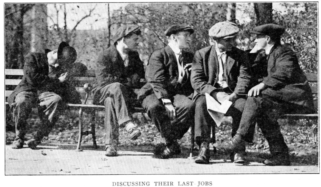 It is not always he of the tattered garments who is the greatest sufferer. A large number of those most unfortunate members of the working class,—the white-collared company of clerks,—may be seen filling the park benches. These have the additional disadvantage of having to maintain some sort of a respectable appearance. I noted one of this type, the other morning, arising from his night’s repose on a bench in a secluded arbor of Lincoln Park. A piece of newspaper was placed within his vest to protect his shirt-front and his collar and tie, carefully wrapped in paper, were beside him. He produced a small whisk broom from his pocket, and a comb, and made his pathetic toilet, not forgetting to polish his leaky shoes with the newspaper. He was not the type that dares to beg for a meal on the street and one could sense somehow that he had not the price of breakfast. I entered into conversation with him and discovered that he had worked in the auditing department of the Illinois Central Railroad. Two months ago he had been discharged on account of a cutting down of the staff and since then had found nothing but one or two odd jobs. I asked him whether he had been to the state free employment office. He said that he had and that once he had been dispatched to a residence to do odd jobs. On arrival there, he had been made to do some painting and other work which falls within the province of skilled labor and for which the current union rate is 65 cents per hour. For this he was offered twenty cents an hour. He was rather an unusual type of clerk because he refused to do the work; for which I honored this obscure hero of industrial warfare.