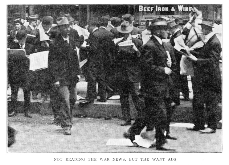 Besides the permanent industrial population of Chicago, casual workers are pouring daily into the town. Every freight train and passenger has its complement of jobless ones. These add to the number of job seekers and still further intensify the terribly keen competition on the labor market. In the crowded “Loop” district, thousands may be seen every noon awaiting the afternoon papers with their lists of offered jobs. When the newsboys appear they are virtually mobbed by the work-hungry crowds; and then comes a feverish scanning of the advertising sheets, and then a rush to be first applicant. One glance at the number of vacant positions in the paper and then at the size of the crowd will reveal the appalling difference in their respective, numbers.