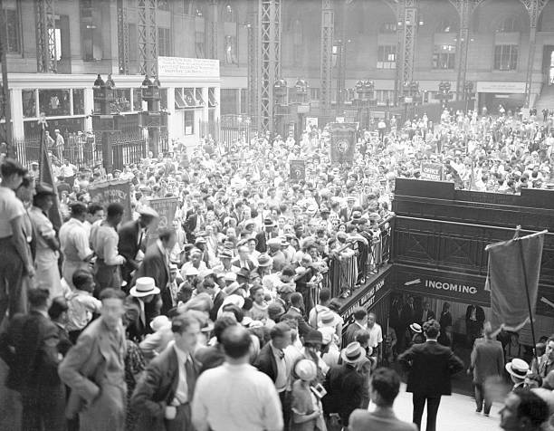 While this delegation waited on the platform, more than 500 others milled about the track entrances on the level above, and over 9,000 workers packed the south half of the main hall upstairs.