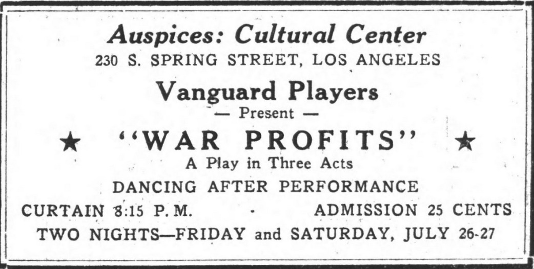 This phenomenal growth has taken place within the short period of nine months! Add to this that the locale maintains the reputation of being the largest bourgeois entertainment center of the world, and a reactionary stronghold for Chandler and Hearst. Then the record of the workers’ theater in Southern California takes on majestic proportions.