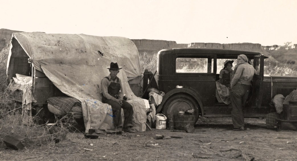 Thousands of American families since 1929 have been forced out of their homes and farms on to the open road. They migrate from city to city or from state to state in search of employment. Often with their last few dollars they purchased an old trailer or built a “house” on the chassis of their broken-down automobiles and started the great hegira to escape starvation. Thousands of them gravitated to California where the climate is generally suitable for all-year camping and where seasonal crops require nearly 200,000 migratory workers.