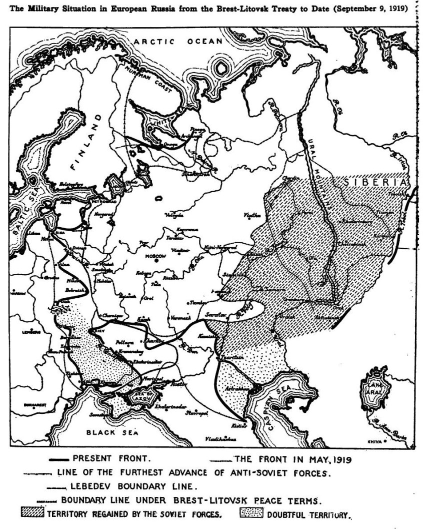 In this review I can give only an outline of each front separately, basing my information mostly on official documents which have at last reached here from Moscow. In many cases they confirm statements previously made by me in Soviet Russia, with regard to the civil war in Russia; but since the receipt of these important data from Moscow, with real military maps, and long and detailed descriptions of battles, I can now see clearly what I could only guess at in the past.