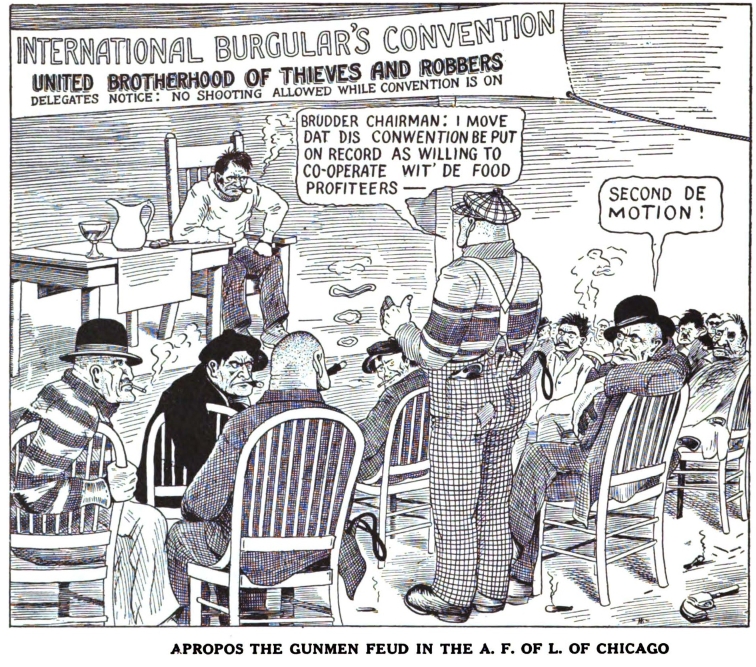 4. The labor union slugger and gunman. It is this latter type that has recently sprung into prominence in Chicago, incidentally revealing the fact that there are immense bodies of workers—tens and tens of thousands–“organized” in the A. F. of L. who do not actually constitute bona fide labor unions, but who merely are victims of gangs of bandits—thieves and murderers—who have gotten control of their unions or themselves “organized” the unions and taken out charters in the A. F. of L.